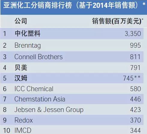 8月4日,2015“ICIS安迅思化工分銷商100強(qiáng)”年度全球榜單揭曉,中化塑料首次登上亞洲化工分銷商排行榜榜首,銷售額遠(yuǎn)超排名第二的Brenntag。